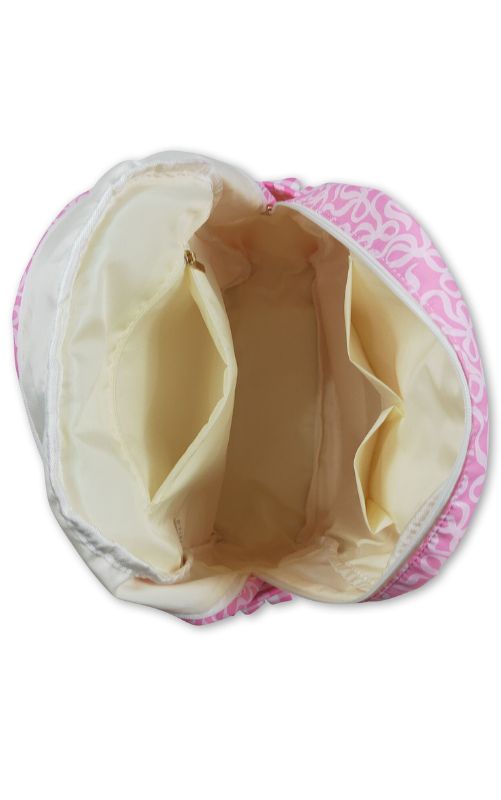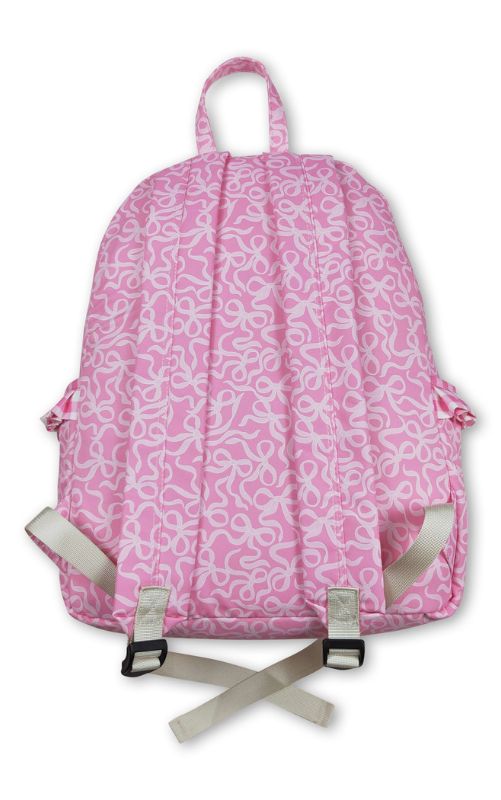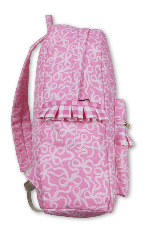 A beautiful and delicate girls backpack. Pink bow print with gingham ruffle detail, she will love it and make her school day special. A great bag for our ballerinas but also a diaper bag. Front pocket and side pockets for water bottle such as inside pockets and zipper. Size: 13*5*17 inches.