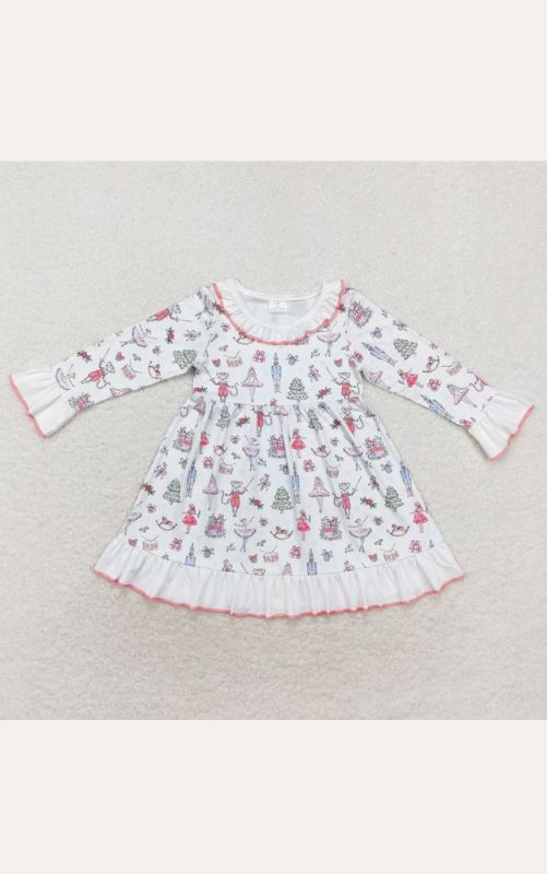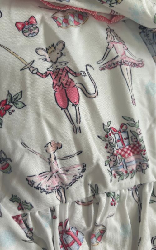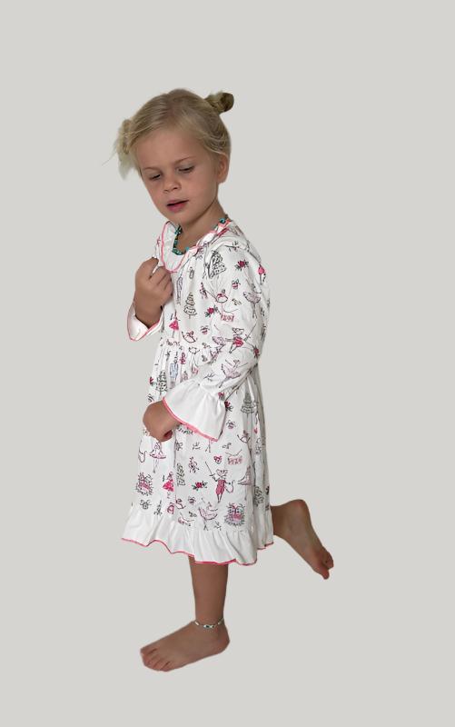 The Nutcracker pretty print, white with ruffle details and red embroidery. For all little ballet lowers this night dress is a dream, extra soft milk silk fabric, fits true to size. A big hit and perfect present! Fits true to size, Holiday Limited Edition.