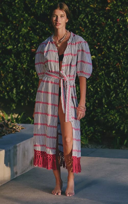 This classic shirtdress is versatile and chic with its elastic cuff 3/4 sleeves, boho crochet fringe detailing at the hem, self belt and row of buttons down the front. The perfect transition from beach cover-up to night-out attire. 100% cotton.