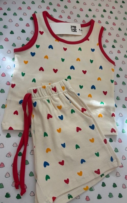 Cute, comfy, and made for everyday fun, the Terry ST Set in Heart is a sweet essential for warm days. Crafted from soft terry fabric, this easy two-piece set features a relaxed tank top and matching shorts designed for all-day comfort. Set against a creamy background, colorful little hearts are scattered throughout for a playful, cheerful touch. Perfect for lounging, playdates, or sunny outings, this set blends comfort and charm in the most adorable way.