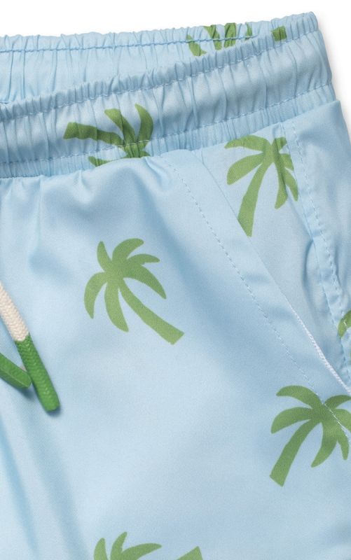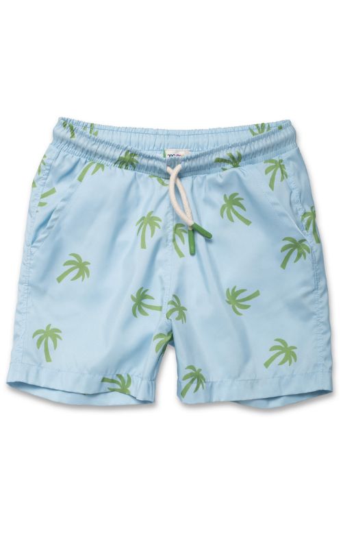 A retro palm tree swim trunk made from recycled marine plastic, featuring a fun, colorful print, UPF 50 sun protection, and a comfortable inner mesh lining. Matching top top available, fits true to size. Must have ❤️