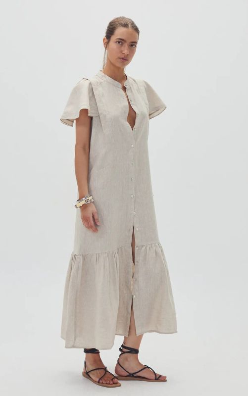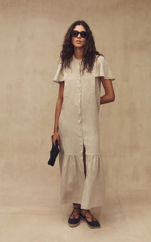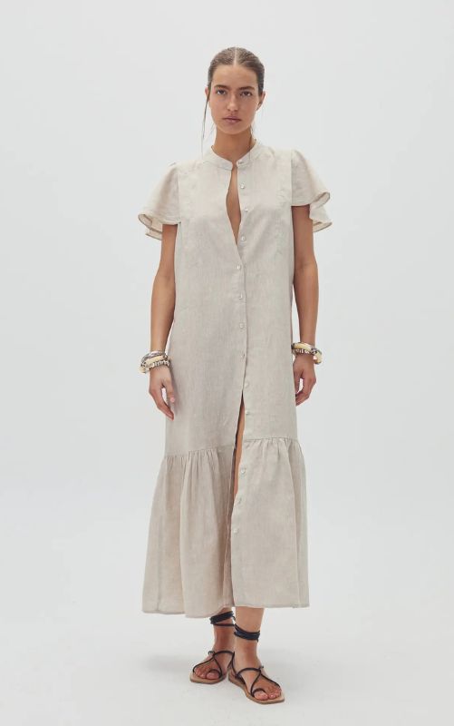 We love this natural color, the Willow Dress is a classic and versatile piece, crafted from 100% natural linen that’s been pre-washed and softened for comfort and an effortless drape. It features a mandarin neckline, shell buttons, and soft flutter sleeves. The gathered ruffle hem adds subtle movement, making this dress easy to wear and timeless in style.