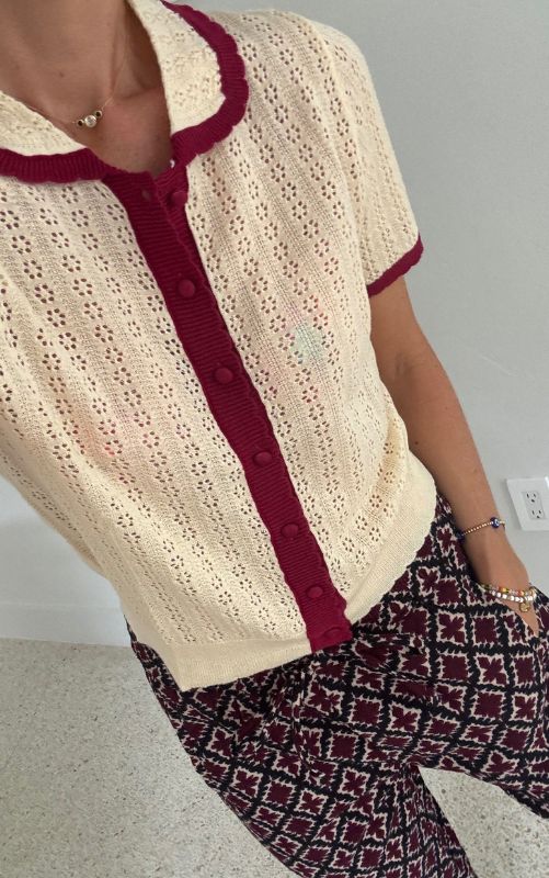 A chic and fitted silhouette with an allover pointelle design. The front placket, sleeve cuffs and hem are trimmed with contrast scallop crochet detailing. A chic top to wear with jeans, linen shorts or pants. Fits true to size.