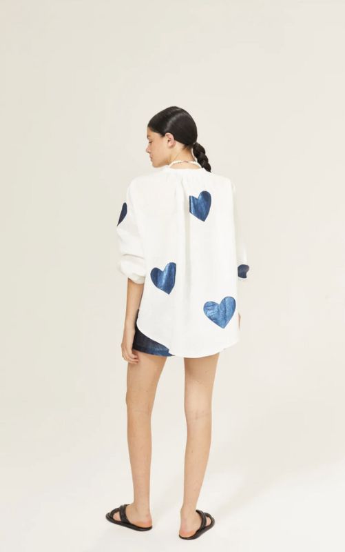 Crafted with 100% linen fabric, it has heart-shaped foil pink appliques that add a feminine and super fun vibe to this style. Matching pants and shorts for a total look.