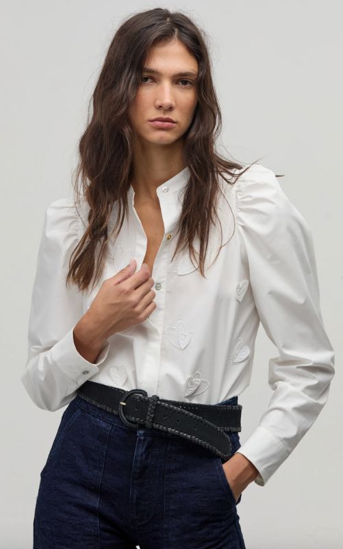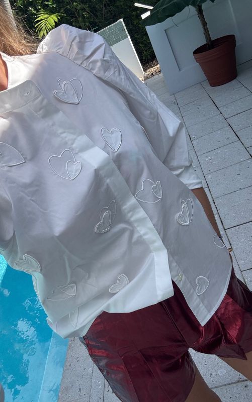 For the most romantic. The Camisa Cuore in cotton features hearts applied and embroidered on the front, giving it a fun and feminine touch. It has dropped shoulders and slightly gathered details, which are super flattering for any body type. This shirt has a mao collar and mother-of-pearl buttons, making it ideal for all types of occasions.