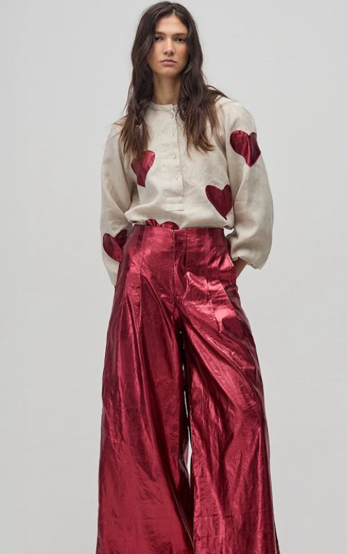 Crafted with 100% linen fabric, it has heart-shaped foil pink appliques that add a feminine and super fun vibe to this style. Matching pants and shorts for a total look.