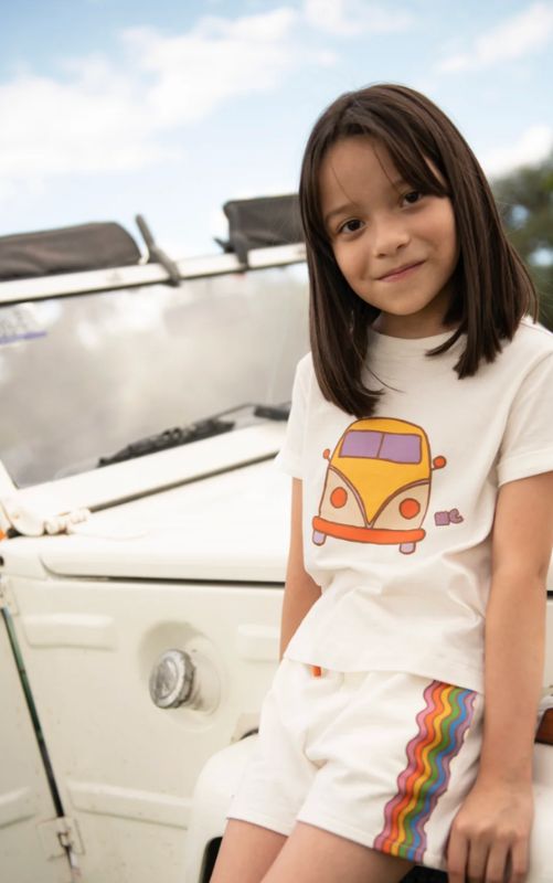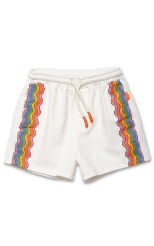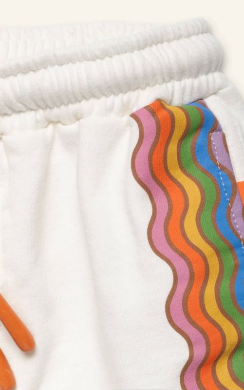 A retro-inspired pull-on short featuring a bold rainbow wave graphic along the sides, with a nod to 1960s surfer style. Crafted from soft recycled and organic cotton with an elastic waistband and adjustable drawstring for an easy, everyday fit. Responsibly produced in Portugal.