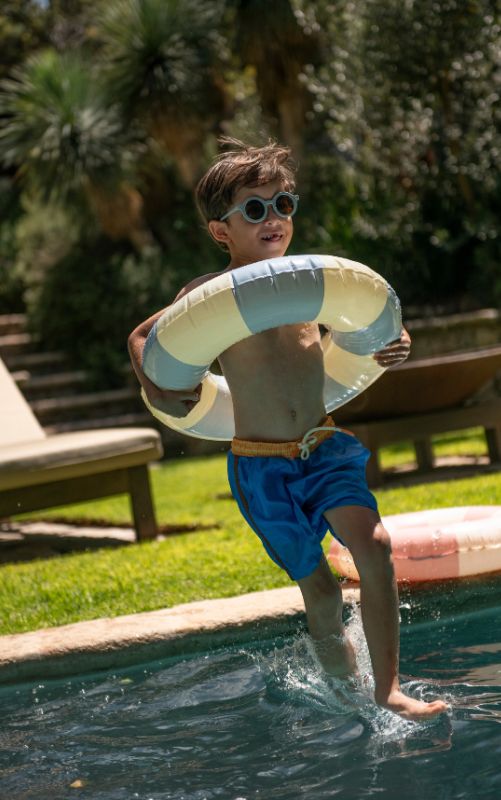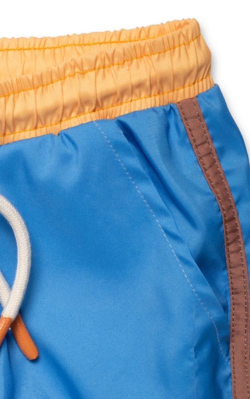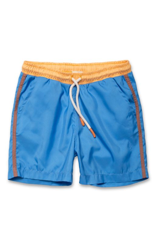 A colorblock swim trunk in bold blue tones with contrasting detail, made from recycled marine plastic with UPF 50 sun protection. Matching top available, fits true to size.